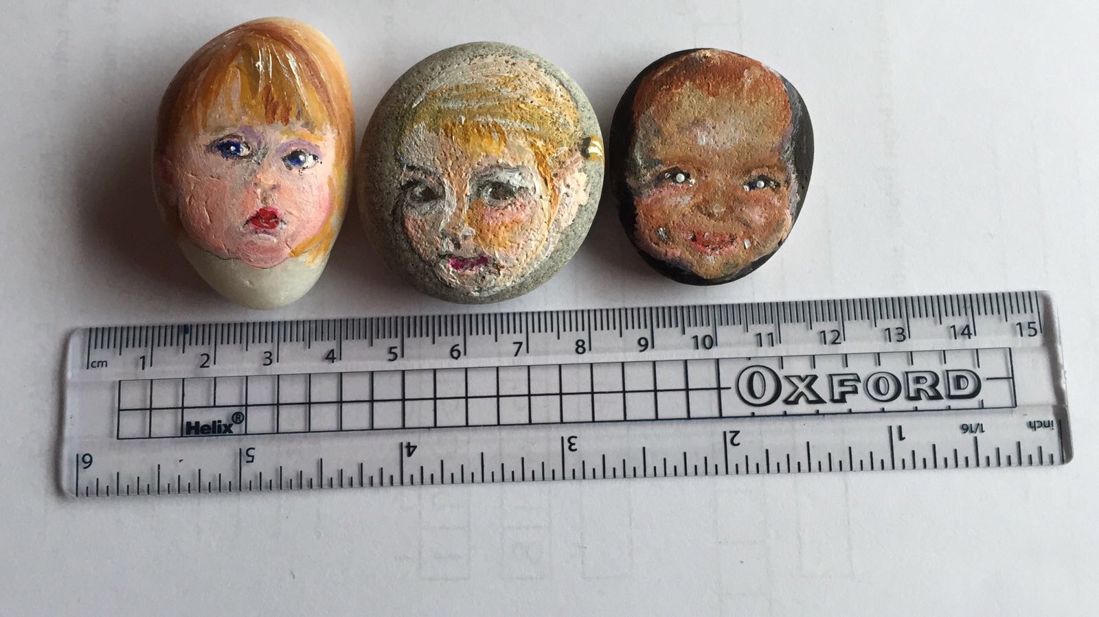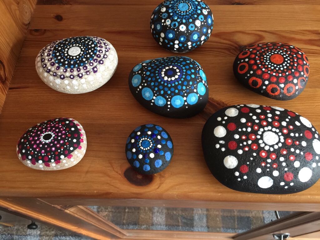 Irene brought along samples of her amazing new hobby. Stone painting, on stones found on the beaches of Findhorn. She started with dots, then went on to dogs and animals and then made a great attempt at my three little grand daughters. I told her she should go to Udaipur in India and study with the great masters who specialise in miniatures, painting with camel’s eyelashes.