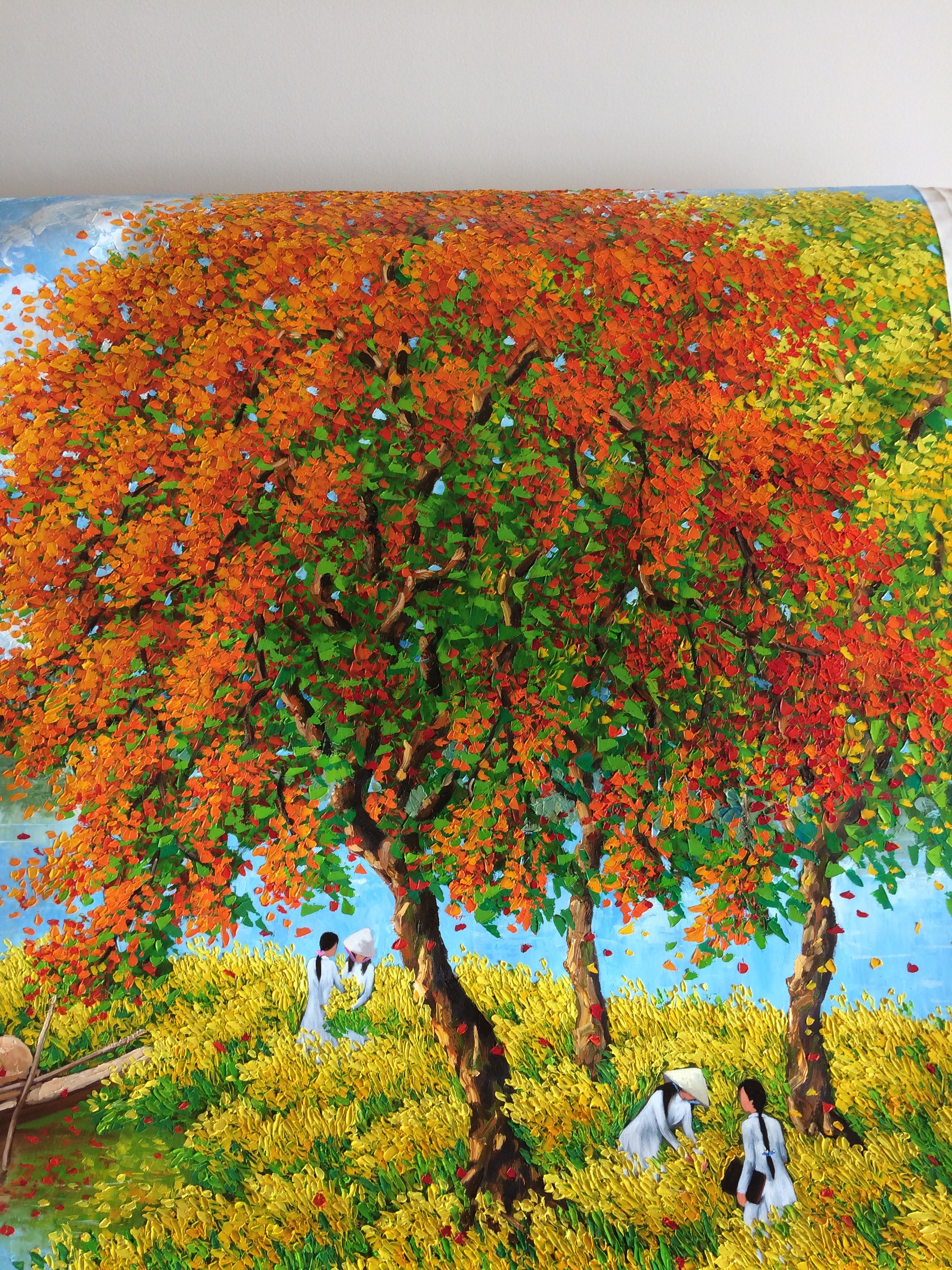 The hallway carpet has been ripped out, furniture is piled up, and the King Wa plant is now lurking behind the sitting room door. I feel as though we have just moved in, and on top of all this confusion we have bought a new painting from Vietnam. It is so vibrant, obligatory sunglasses might have to be issued on entrance. Actually it is still at the framers. It is about 4’ x 4’, oil on canvas, by Duong Ngoc Son; when we get it back we may have to rearrange the room.