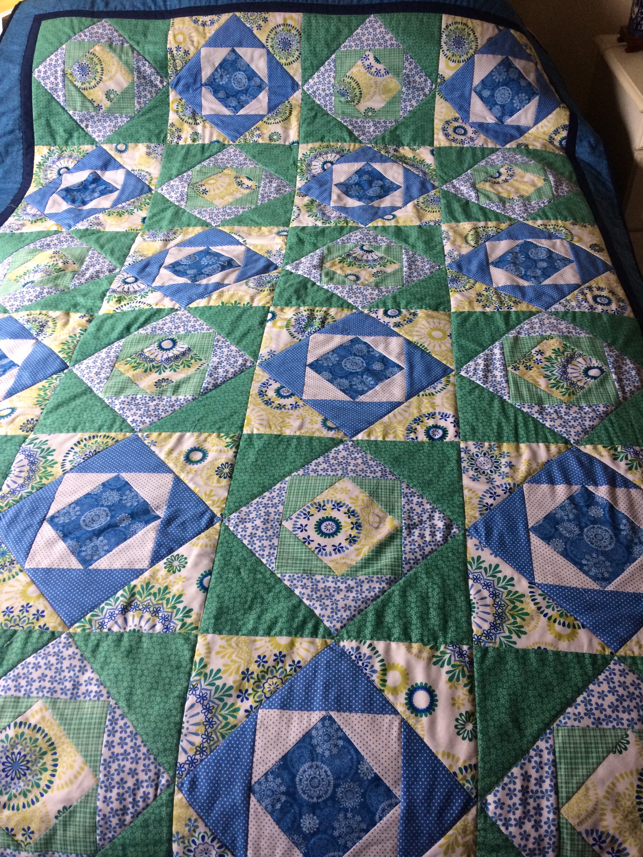 The quilt is finished! I sat all afternoon unpicking the newspaper hexagons that formed the patterns for the slippery silk….it has been more than a hobby and more than a means of keeping sane.