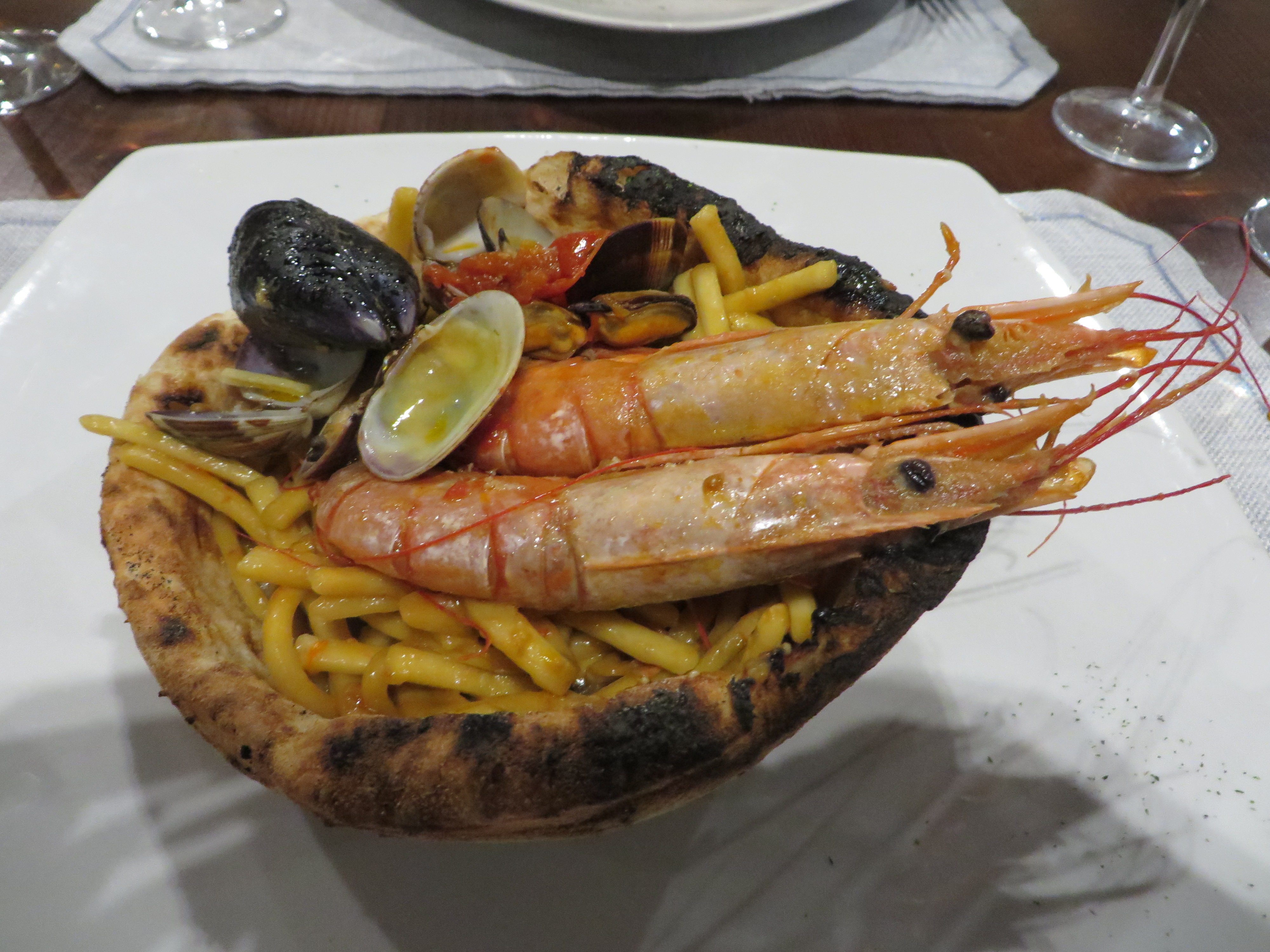 We ate pizza which was delicious, but I couldn’t help ogling the diners on our right. They had a plate made out of pizza dough, filled with shellfish. I looked at the menu all in Italian, it looked like double Dutch to me. The following night I did order it (courtesy of the waiter) and it was vaguely disappointing.