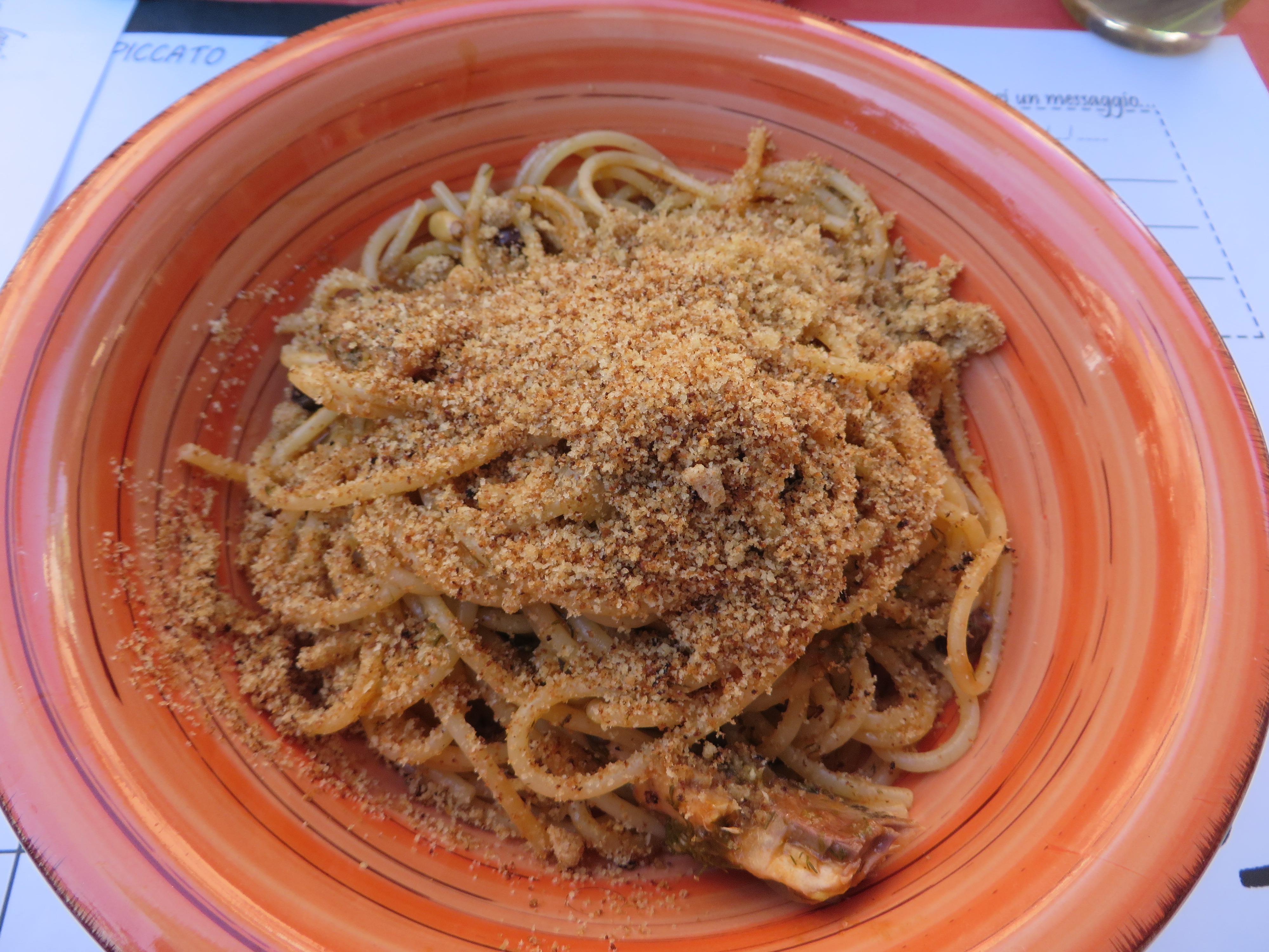 We found a restaurant selling ‘traditional Sicilian food’, so we chose pasta con le sarde. It was awful. Literally a can of sardines between us on a bowl of spaghetti and a bill for 24 euros. Sort of thing you might feed your cat. It is supposed to be the national dish of Sicily. Maybe one day we will taste it cooked properly.