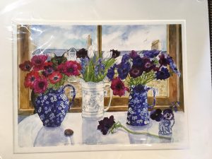There were about 77 venues in all, so a lot of people had given over their houses for the festival. The paintings were all a bit ‘samey’ – sea scenes and harbours and depictions of the Cuillen mountain range. We were about to go home, but …. we came across a room full of paintings of flowers. And we were hooked! So we bought two prints by Gill Smith, an Edinburgh artist; they are stunning and fresh and full of colour.