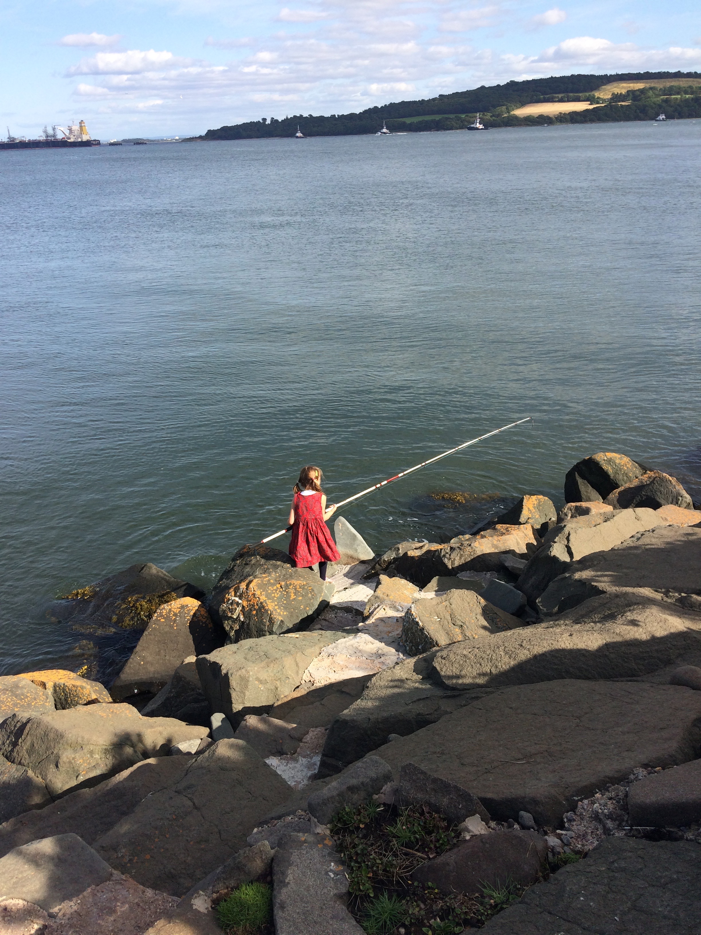 I had my maiden voyage on a flat, sunny sea, and it was so peaceful. I rowed and dropped a line over and secretly was quite relieved that I didn’t catch anything, as I had visions of a mighty cod dragging me off to America. Little Bonnie had a go with the big fishing rod from the shore, and in minutes she was able to cast and reel in the line. We were all amazed. That rod is heavy. She said she would like a pink one of her own and then she would fish every day.