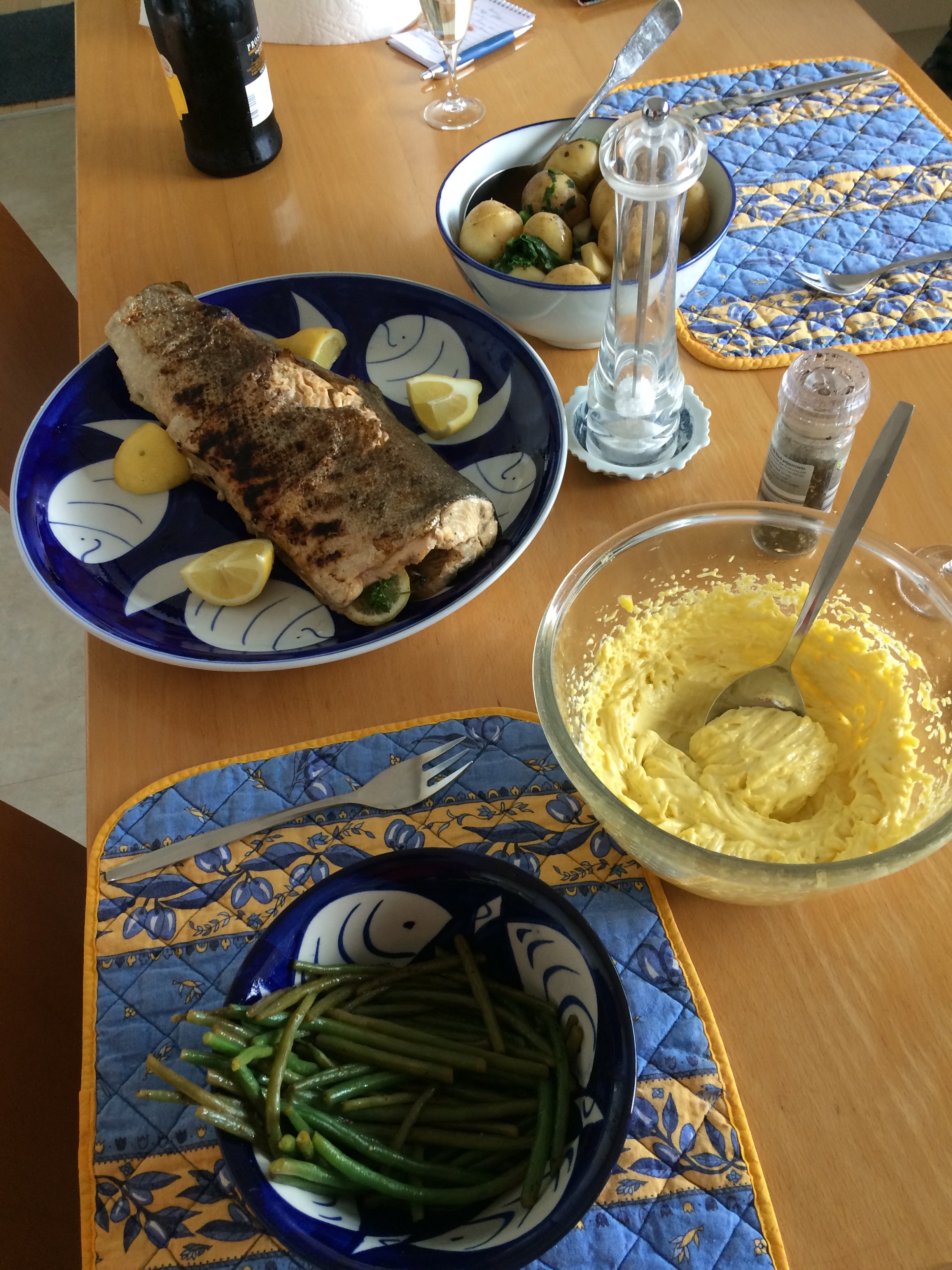 John and Nick went off to the angling shop to buy some more hooks, as fishing has been such a success this summer. We have relished two huge sea trout (with lemon aiolli) and last week a mackerel.