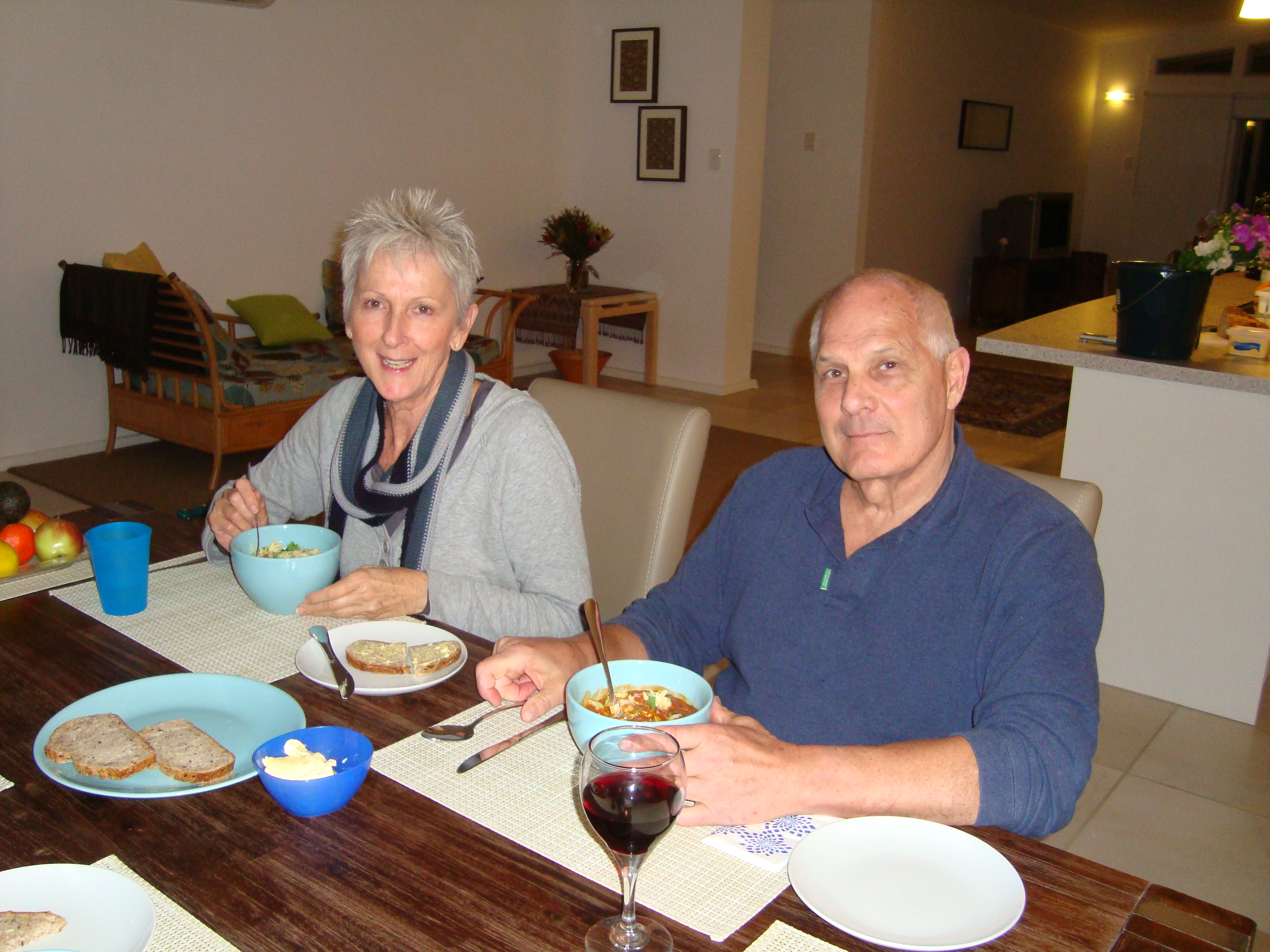 I created a menu for Lyn, wrote it out and served up delicious things, most of which I had never done before… the main course was quails! She loved it all, the garlic ginger prawns, spicy corn chowder, poached pears in red wine and cinnamon, and especially the poor little birds with their little wavy legs! And now she’s gone, and we have time to catch our breaths before going to Melbourne in a fortnight. I am looking forward to that, then on down to New Zealand again. John is meeting a colleague who is Korean and is apparently ‘thirstily awaiting him!’ He told John that he would love working in NZ, such a relaxing country, so much to do etc. Might explain why the job is 2 years behind! We are also going down to Queenstown in the South Island… apparently there it is still very cold, and the rugby teams are taking bad with the weather… though not the Scots of course… they just fit right in!