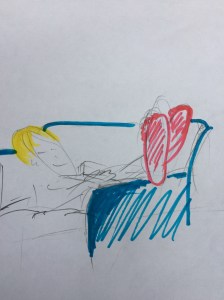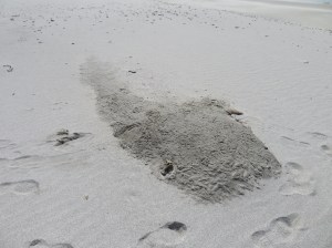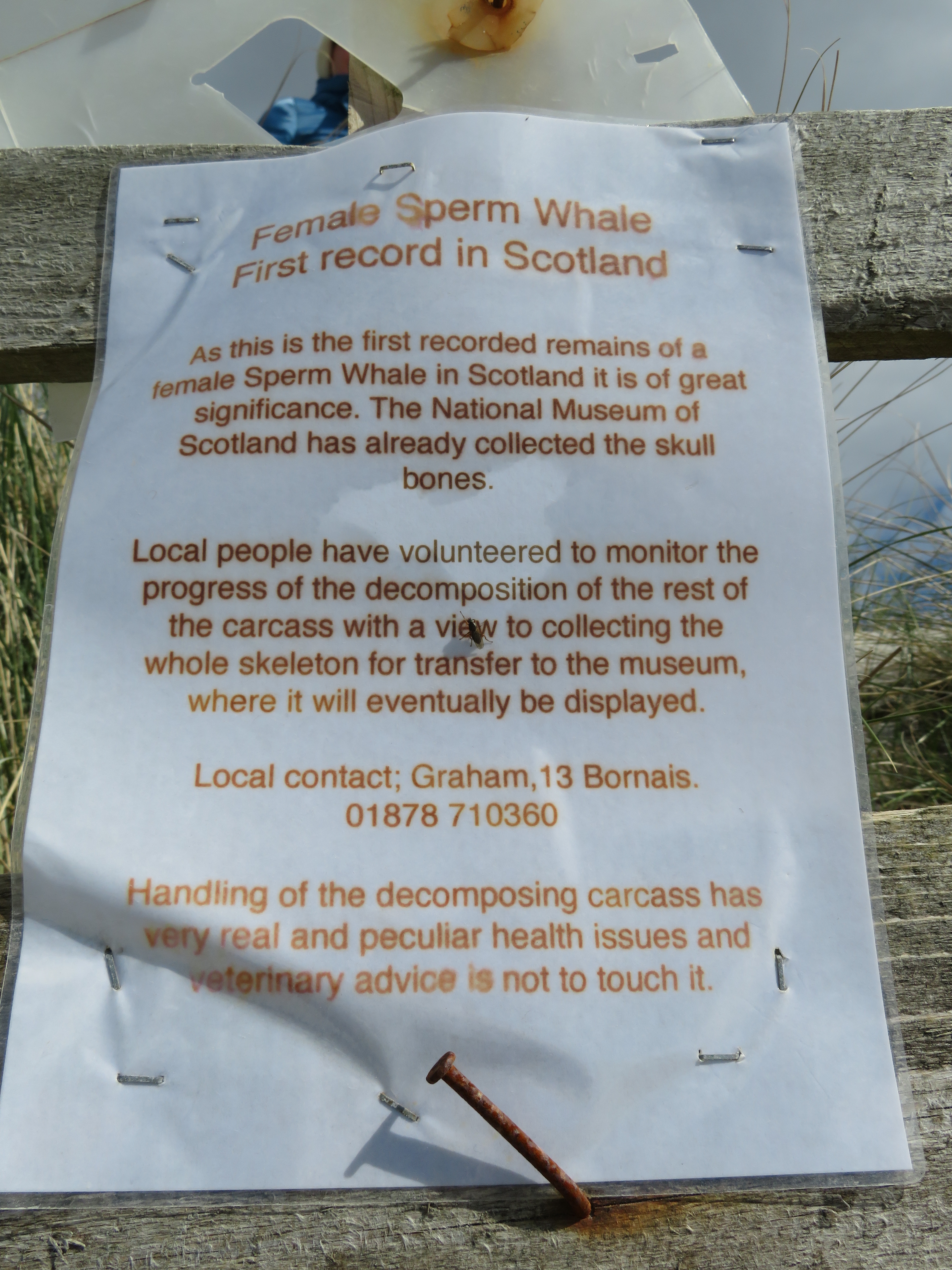 We found an ominous large lump in the sand, so we both gave it a push with our boots. It was spongy and soft. Then I noticed a piece of paper nailed to a post on top of the dune. I clambered up like an agile goat and it said how this was the body of a sperm whale that had washed up on the shore and it was to go eventually to the Museum of Scotland, but the local people were monitoring its decomposition. No one must dare to touch it… dreadful diseases could be transmitted. Oh well.