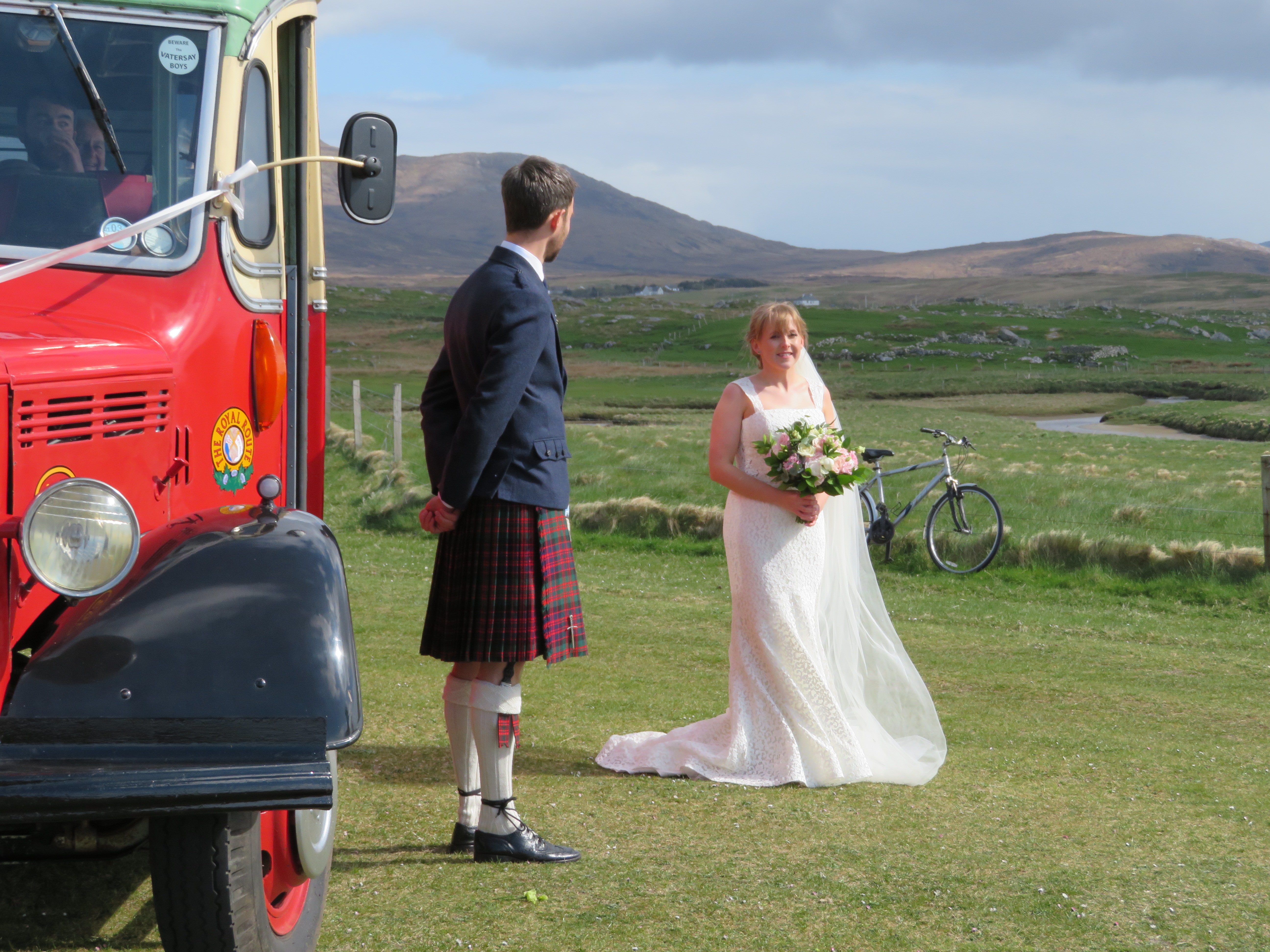 We rounded a corner and came to an open field, and there was a MacBrayne’s bus and a bridal party lining up for their photographs by the Atlantic ocean.