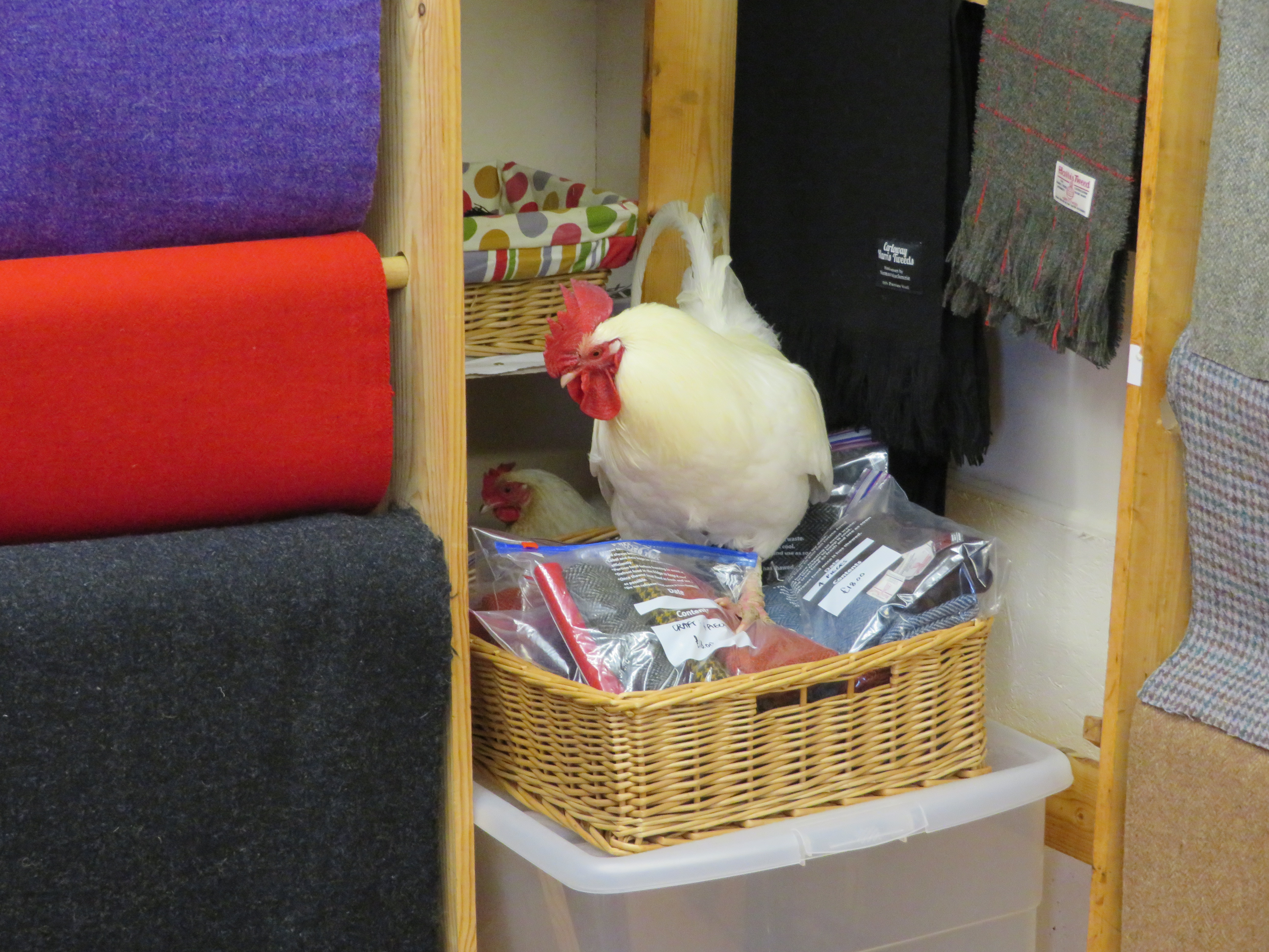 The weavers weaving their tweed have to have their looms in a shed next to their house, or it is not classed as the Real Thing. We learnt all about it from the very devoted wife of Norman, the chief weaver of Carrloway. She was so enthused with her story and product she did not see a cockerel and hen make their way into a display box and lie courting amongst the profits. We had a laugh as they were shooed out clucking and squawking and quite annoyed that their afternoon sleep had been disturbed.
