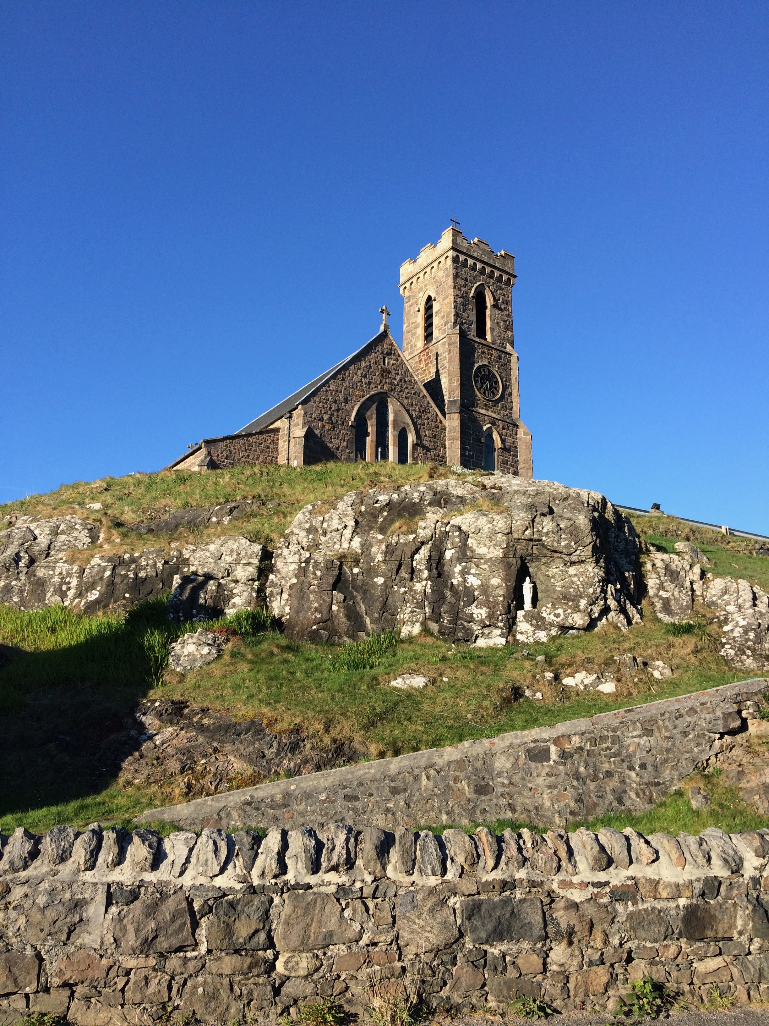 On the first of May we sailed away from Oban, five hours it took by the MacBrayne ferry, over the Minches to the Island of Barra. The sea was like blue glass and we idled the time with binoculars sighting landmarks we recognised from other trips: the Morven and Ardnamurchan peninsulas, Mull and the distant shapes of the mountains of Skye. I stared at the sea as ripples of spume broke into white froth, hoping and hoping to see a whale or a porpoise… but there was nothing, well, nothing that I saw. We drew into Castlebay in Barra and, looking about, I saw a smattering of houses dominated by a large RC church built above the harbour.