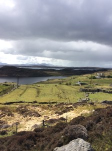We drove north to Benbecula, and over the causeway to North Uist and the Lochmaddy Hotel. As we drove I couldn’t help thinking the road and scenery were like fine lace lying on perpetual water. We skimmed across sea lochs, pools, freshwater lochs and it was just all so watery, and then round a corner there would be the glittering sea lying waiting again, a reminder that it was not far away. Dotted around were crofts and stone houses, seeming to have been built with no rhyme or reason; there didn’t seem to be a village as such, but occasionally a school or post office and a dismal Co-op signalled an area of importance. Where were the clothes shops? Where could you buy a new red T shirt? There were notices on the wall of the Co-op advertising Bingo, and Pub Quizzes, ‘Eyes down at 7.30!’